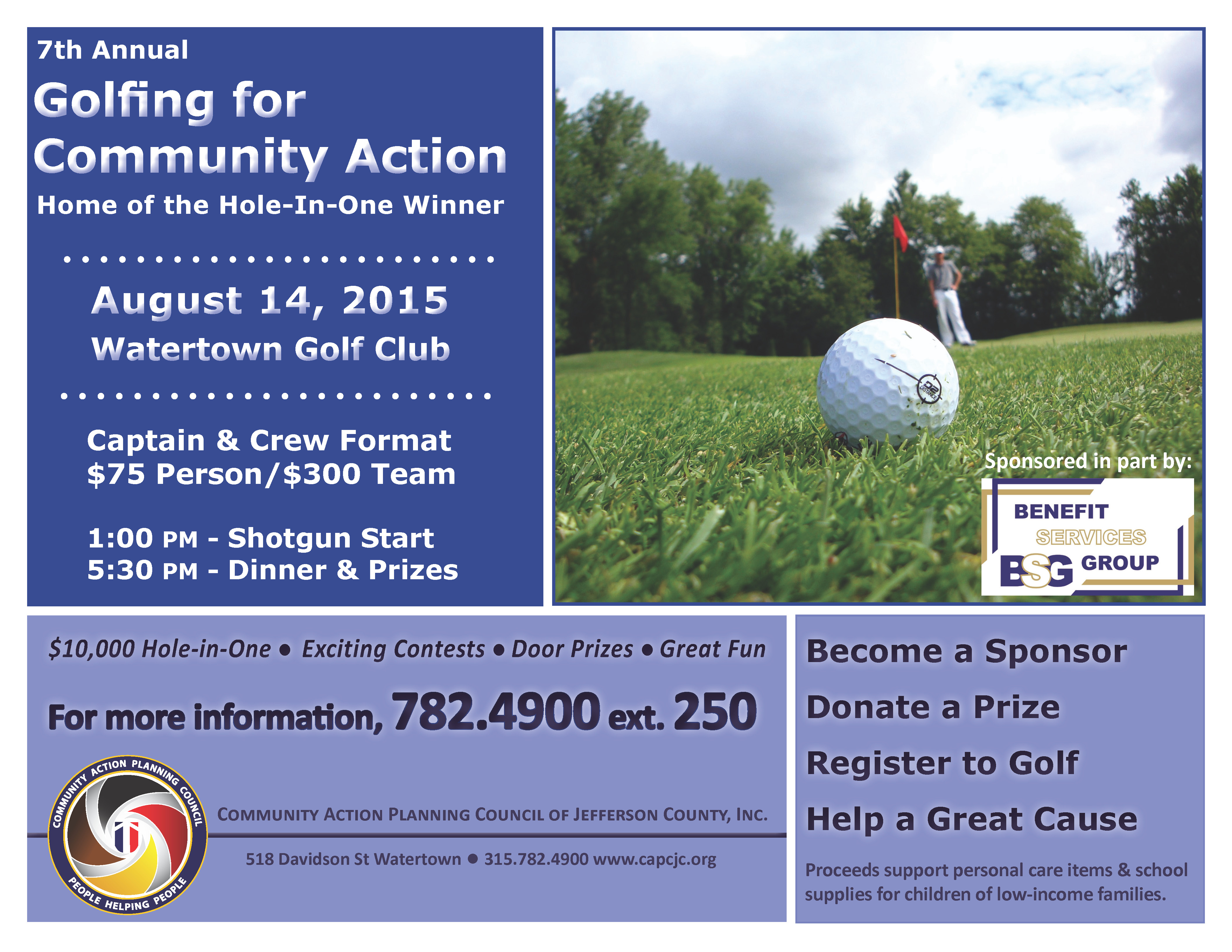 On August 14, a fun-loving group of people will get together at Watertown Golf Club for the 7th Annual Golfing for Community Action event, presented by Benefit Services Group. We’ll tee off at 1:00 PM and play 18 holes, after which we will unwind with a delicious buffet dinner and door prizes galore. The tournament is played in captain and crew format; cost to attend $75 per person/$300 per team. Registration includes dinner and entry into the hole-in-one contest.