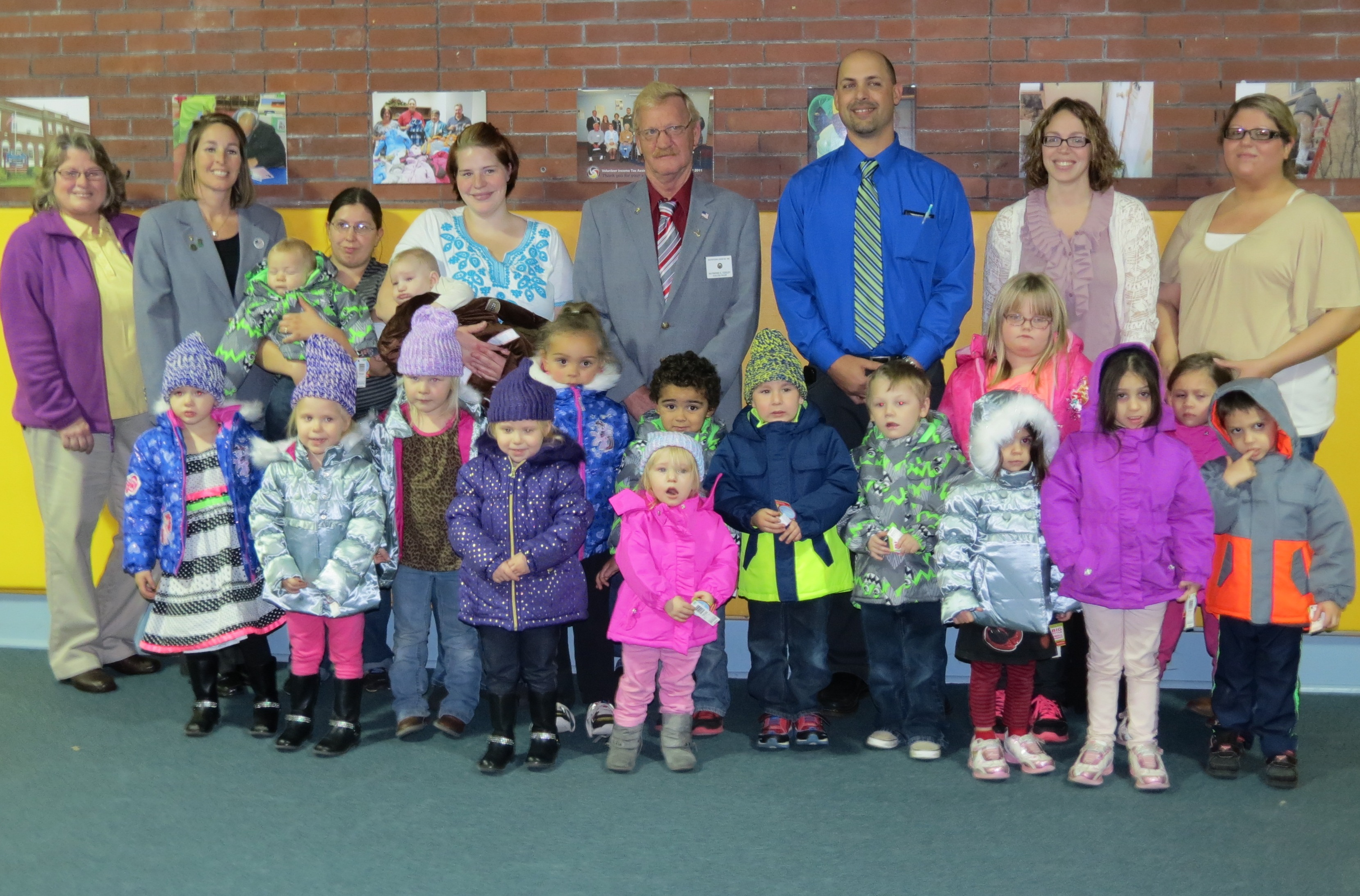 Representatives from the Elks Lodge and Stewart’s Shops stopped by Community Action for a celebration and helped hand out coats.  Our little people greeted them with homemade thank you cards, beautifully crafted centerpieces and big smiles!  Many thanks to our generous sponsors for their support of Coats for Kids!